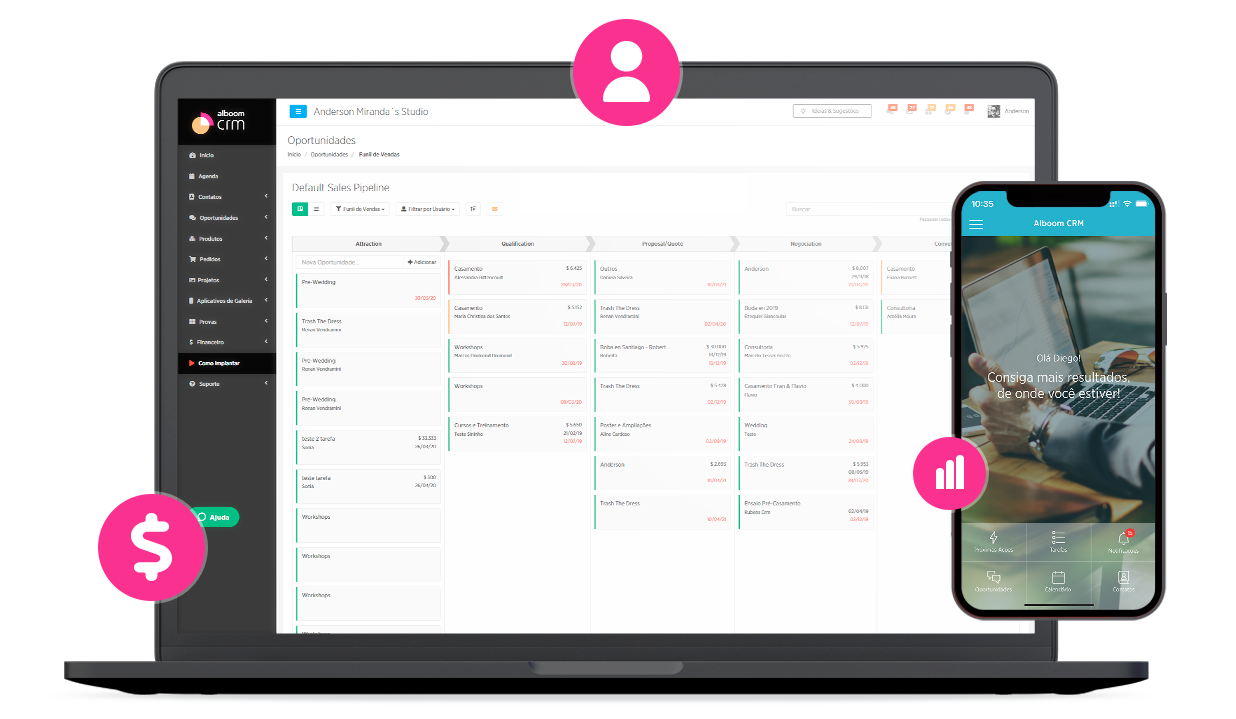 “Não basta ser fotógrafo e dominar nossa arte. Precisamos entender de negócios, o Alboom CRM permite que tudo fique mais visível. Coneguimo entender nossas despesas e nossas receitas, tudo no mesmo local.”