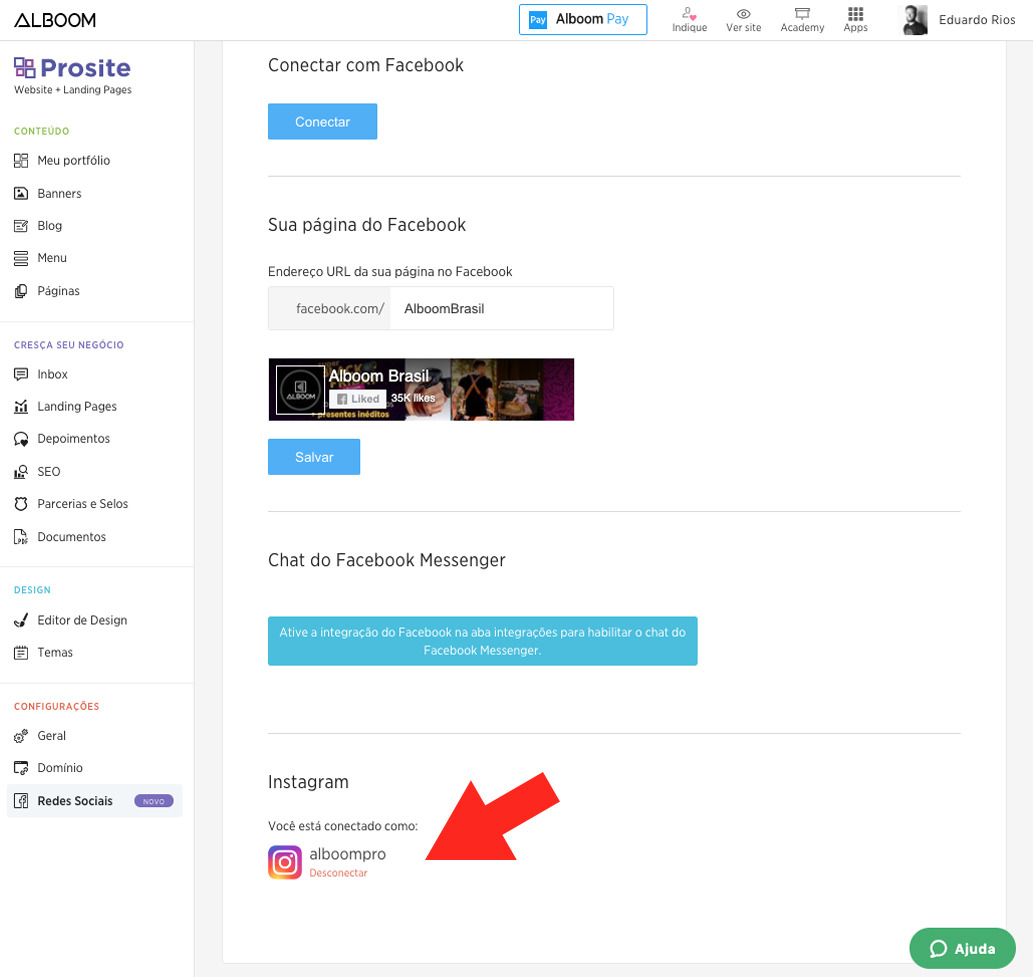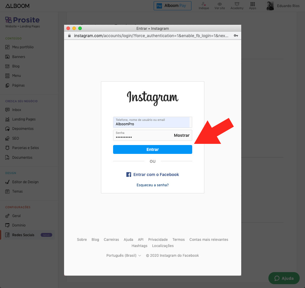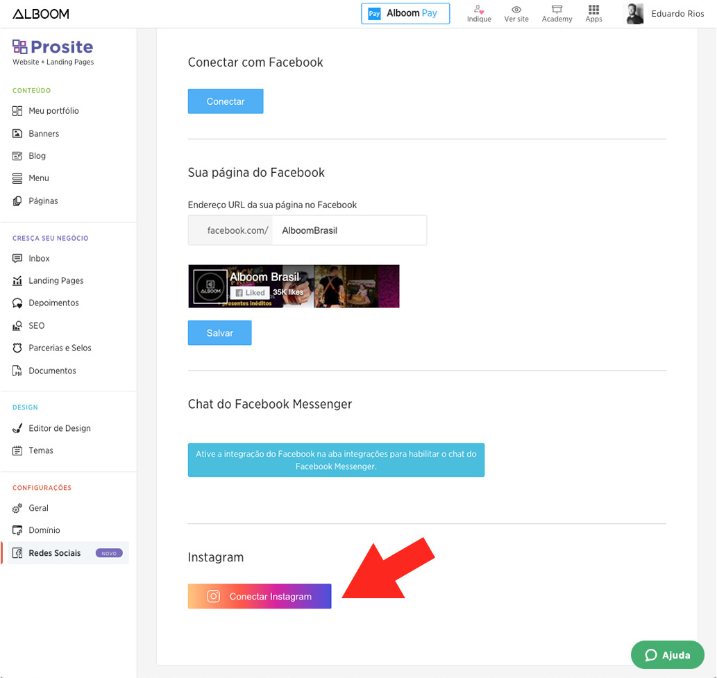 Várias plataformas de criação de site incluem este recurso e para mostrar um exemplo prático de como vincular a conta do Instagram com o site, vamos te mostrar o passo-a-passo usando o sistema de criação de sites Alboom Prosite.
