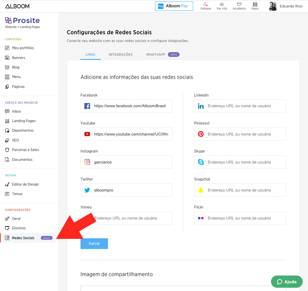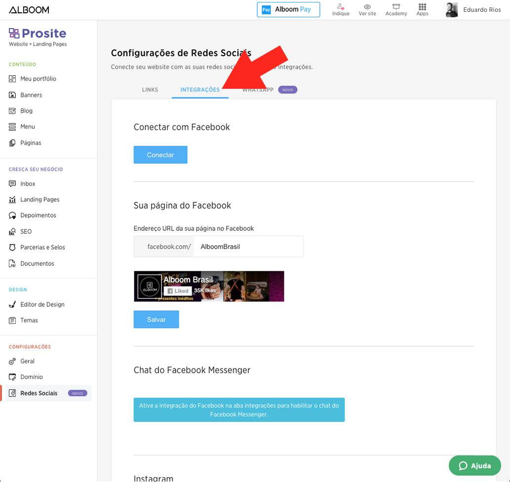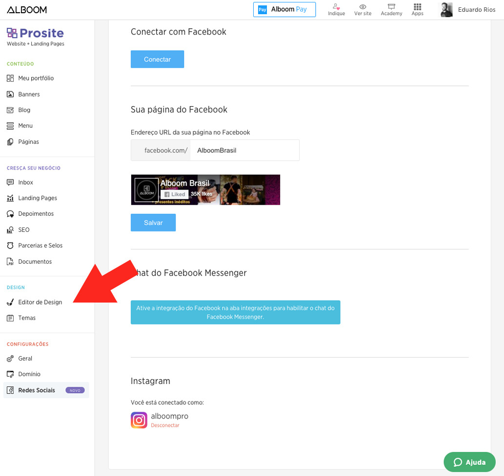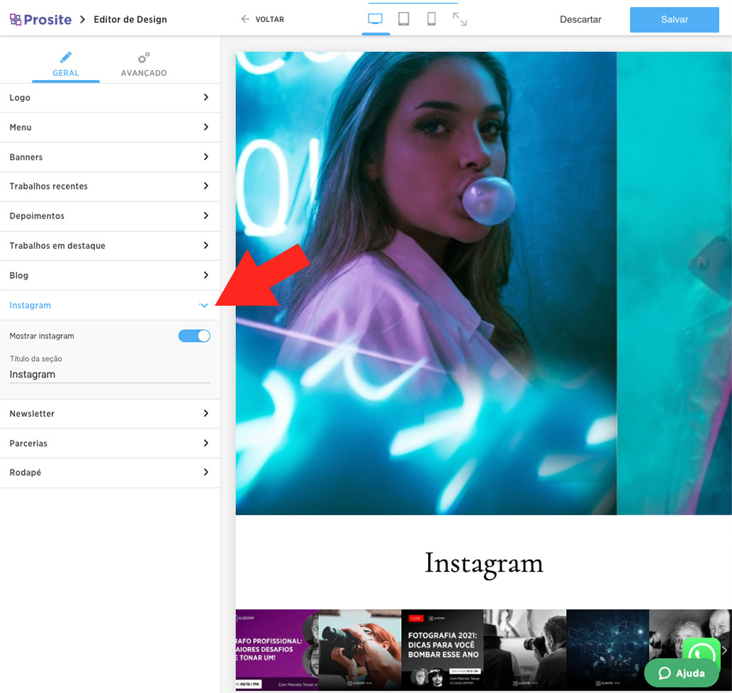 Várias plataformas de criação de site incluem este recurso e para mostrar um exemplo prático de como vincular a conta do Instagram com o site, vamos te mostrar o passo-a-passo usando o sistema de criação de sites Alboom Prosite.