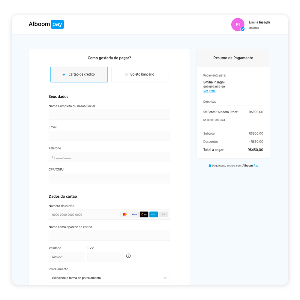 No carrinho, após escolher o plano do Alboom Proof, o desconto será aplicado automaticamente.